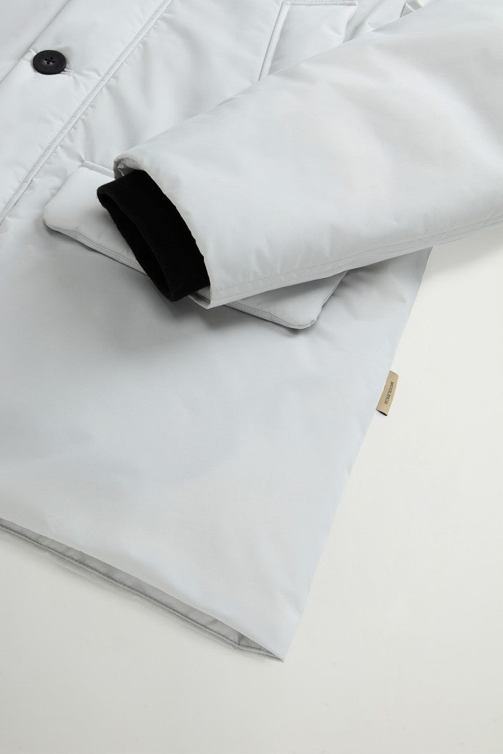 An iconic style reimagined for the Cloud Series—our capsule of outerwear that’s warm yet light as air. Designed to deliver comfort and protection in colder months, this parka combines technical performance with thoughtful detailing. Crafted from water-resistant, windproof, and breathable fabric and treated with a sustainable WR C0 water-repellent finish, it features a fixed hood with adjustable drawcord stopper and a two-way zipper hidden under a snap-button storm flap. Snap closures at the stand-up collar and hem are concealed for a seamless look. The interior features a branded drawcord for a customizable fit. Iconic front pockets include two chest hand-warmer pockets and two lower flap pockets with hidden zips and snap closures. A zippered interior pocket, rib-knit inner cuffs, and printed hood logo complete the look.